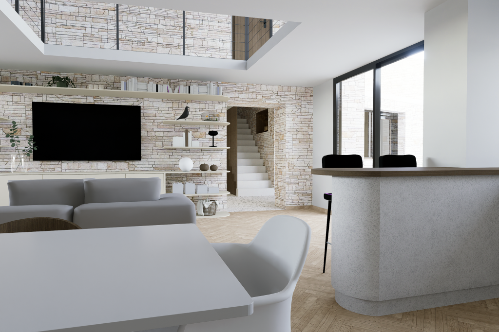 La pierre existante a été conservée et mise en valeur, tout en s’intégrant à l’ambiance moderne globale. Le séjour a gagné en hauteur grâce à l’ouverture du plancher supérieur, permettant une double hauteur au-dessus de la partie salon.