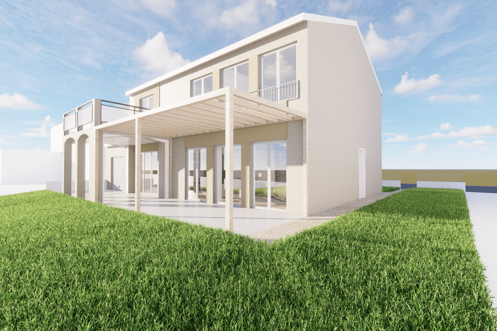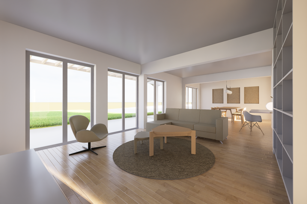 Le projet regroupait plusieurs interventions : création d’une extension pour un garage, aménagement de la terrasse avec création d’une pergola, transformation des pièces « techniques » du rez-de-chaussée en pièces de vie : séjour, cuisine et redéfinition de l’entrée.